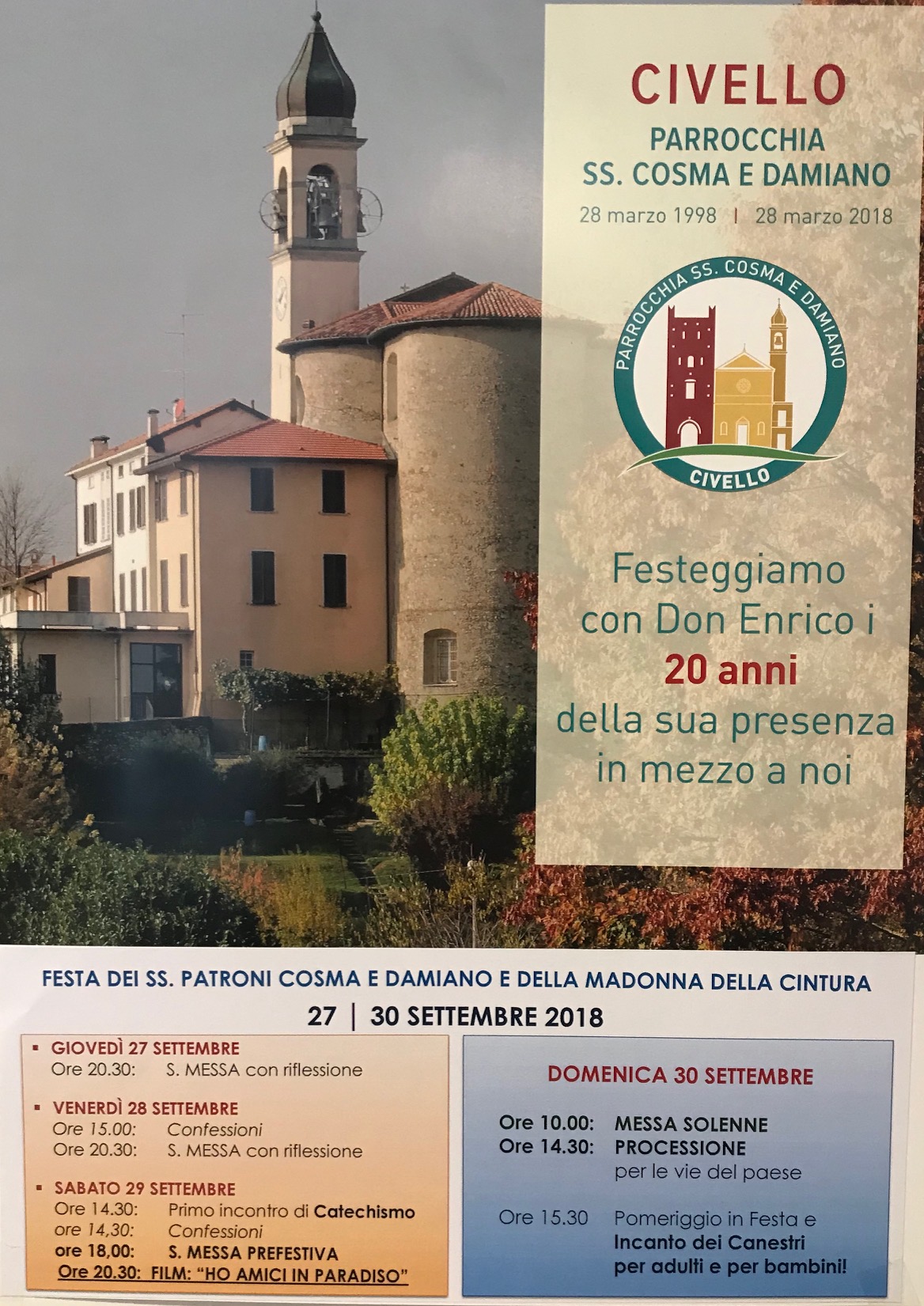 Festa tripla a Civello! Oggi 26 settembre ricorre la memoria dei SS. Cosma e Damiano, santi patroni a cui è intitolata la parrocchiale della frazione di Villa Guardia. Ma l’occasione per festeggiare questa volta è tripla, poiché “dai patroni ai festeggiamenti per la Madonna della Cintura il passo è breve” e, dulcis in fundus, ecco che l’occasione è buona ancheper celebrare la ricorrenza dei 20 anni di presenza nella comunità di don Enrico Colombo, il parroco (arrivato a Civello il 28 marzo del 1998). E così fino a domenica 30 settembre si alterneranno dei momenti di preghiera e di aggregazione per ravvivare lo spirito comunitario.