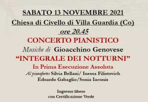 Il pianoforte e le composizioni del Maestro Gioacchino Genovese protagonisti assoluti a Civello. Una prima assoluta da non perdere quella di sabato 13 novembre. Presso la Chiesa parrocchiale dei SS. Cosma e Damiano di Civello, alle 20.45, per la prima volta in assoluto saranno eseguite le opere composte negli anni dal Maestro Gioacchino Genovese. Ad eseguire i brani saranno gli stessi insegnanti della Scuola di Musica di Villa Guardia, della quale il Maestro riveste il ruolo di direttore da 20 anni.