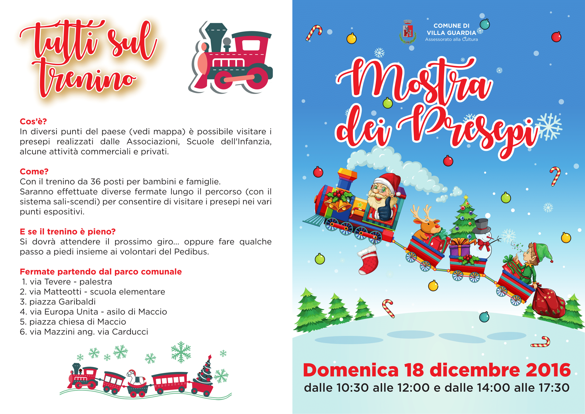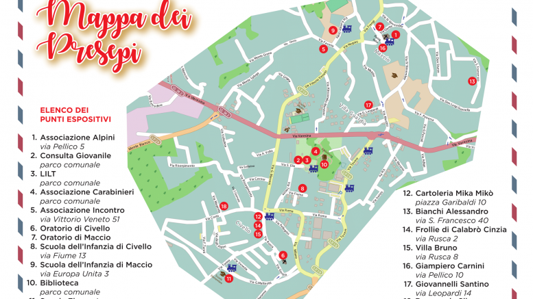 Conto alla rovescia per la Festa di Natale organizzata per domenica 18 dicembre dall’Amministrazione comunale in collaborazione con le associazioni del territorio. Come promesso ecco la mappa della mostra itinerante di presepi e le modalità per “salire” sul trenino che accompagnerà grandi e piccini alla scoperta della magia del Natale.