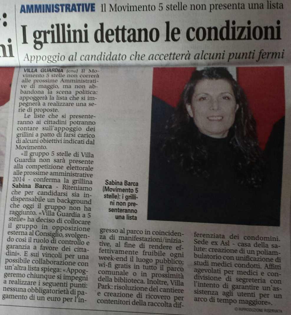 Pubblichiamo di seguito il comunicato inviato in redazione nel pomeriggio e in cui si rivela l’incredibile accordo tra la simpatizzante di Grillo, Sabina Barca, e la lista civica guidata da Piermario Vimercati con Sabina Barca, simpatizzante del Movimento 5 Stelle che nelle scorse settimane non era riuscita a comporre la propria lista. La Barca, fallito l’esperimento solista, aveva dettato in settimana ai due candidati, a gran voce sul Giornale di Olgiate le condizioni utili per poter avere il proprio appoggio: 1) Nessun euro da pagare in occasione delle feste in Villa Balestrini; 2) Wi fi libera nel parco comunale; 3) Trasformazione di Villa Balestrini (ex sede Asl) in un poliambulatorio medico; 4) Risoluzione del cantiere del Villa Park e costruzione di ricovero per la spazzatura. Richieste che evidentemente son subito piaciute a Vimercati, che ha colto la palla al balzo, non dando nemmeno la chance al candidato di Villa Guardia Insieme, Valerio Perroni, di incontrare la Barca. Nella foto, l’intervista a Sabina Barca uscita sul numero scorso del Giornale di Olgiate.