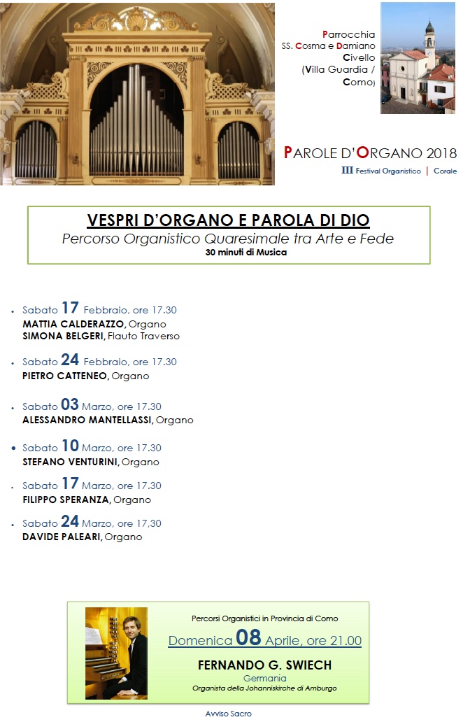 Commenti positivi, come detto, per il prologo presso il laboratorio di Ilic Colzani. Moltissimi i bambini che per oltre 2 ore hanno ascoltato le storie e gli aneddoti dell’organaro di Villa Guardia che, tra l’altro, nel 2011 aveva curato proprio la ristrutturazione dell’organo della chiesa di Civello. “Le domande che hanno fatto i ragazzi ci fanno ben sperare nel pubblico del domani”, ha raccontato con soddisfazione lo stesso Calderazzo, direttore artistico della manifestazione che, con l’inizio della Quaresima, sabato 17 febbraio alle 17.30 darà il via anche ai momenti di musica e spiritualità “Vespri d’organo e parola di Dio”, con lo stesso Calderazzo all’organo e Simona Belgeri al flauto traverso.