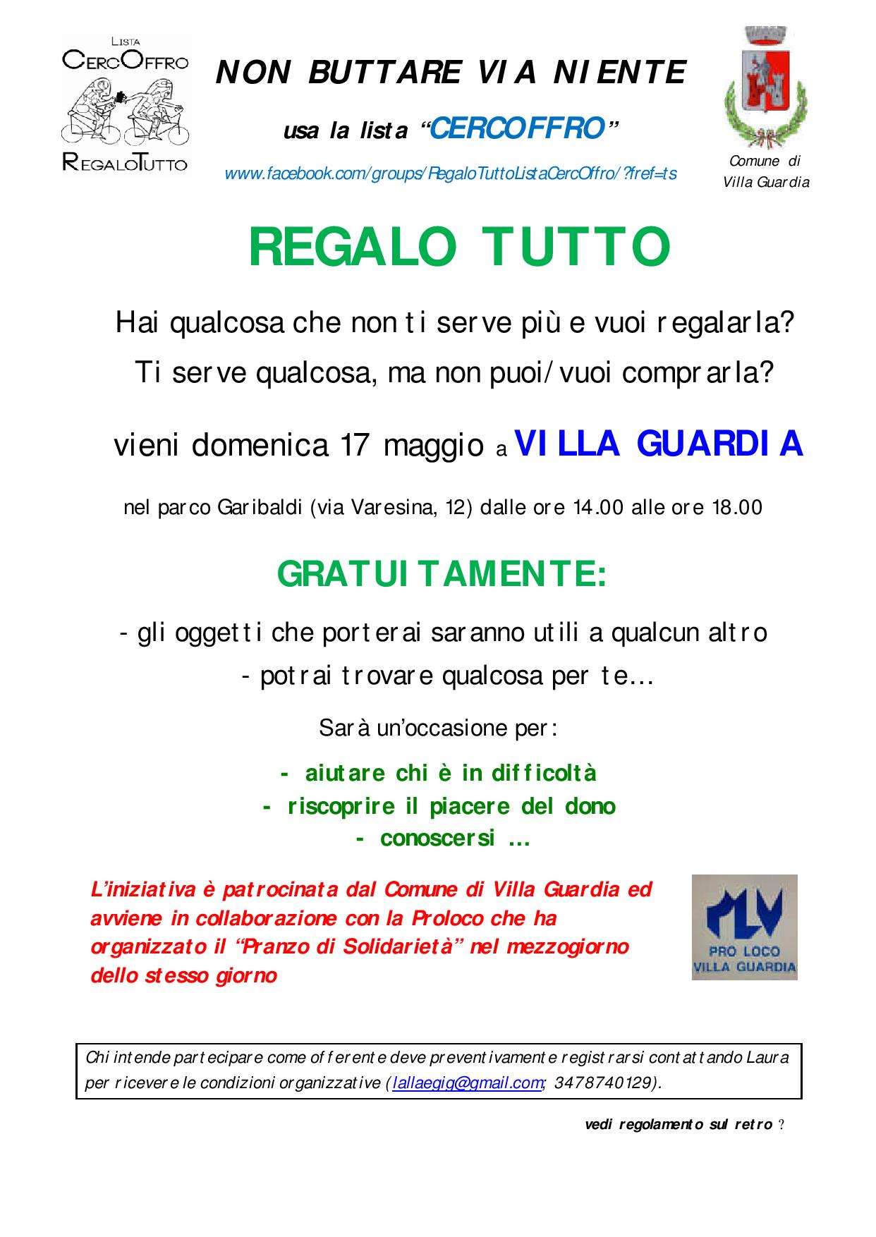 Un mercatino diverso dal solito (nelle foto, la recente edizione di Lurate Caccivio), per regalare oggetti che non vengono più utilizzati dai proprietari o per scambiarli con altri prodotti. Appuntamento da non perdere, domenica 17 maggio, al Parco comunale dove, dopo il Pranzo di Solidarietà, si svolgerà l’originale mercatino (patrocinato dal Comune di Villa Guardia e in collaborazione con la locale Pro Loco) in cui tutto può essere donato o scambiato, senza alcun costo per nessuno.