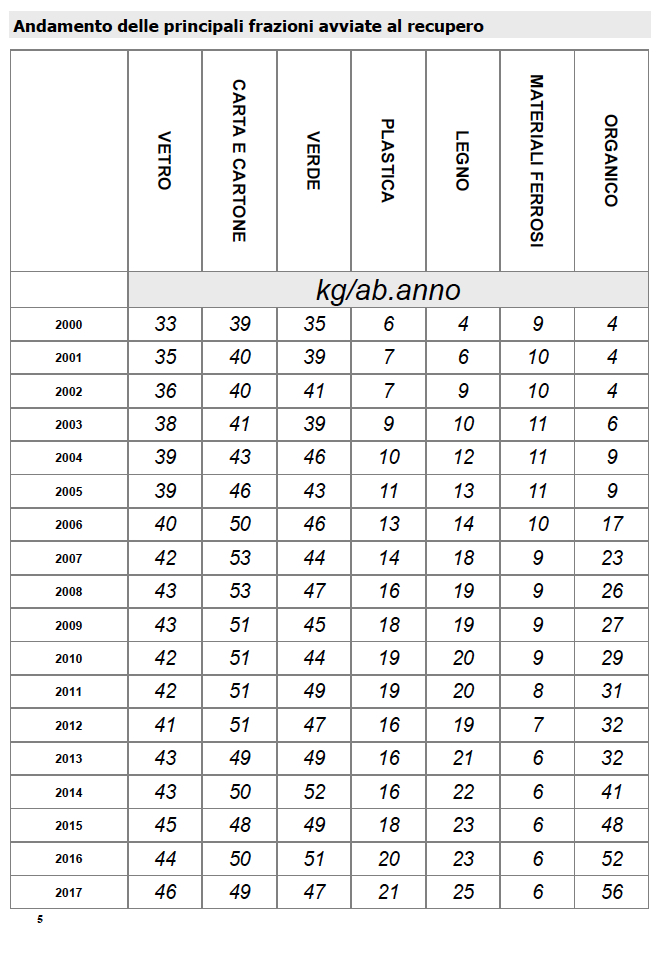 Da segnalare anche il dato che riguarda la produzione pro-capite a Villa Guardia e che si assesta ad 1,20 Kg/ab.GIORNO.