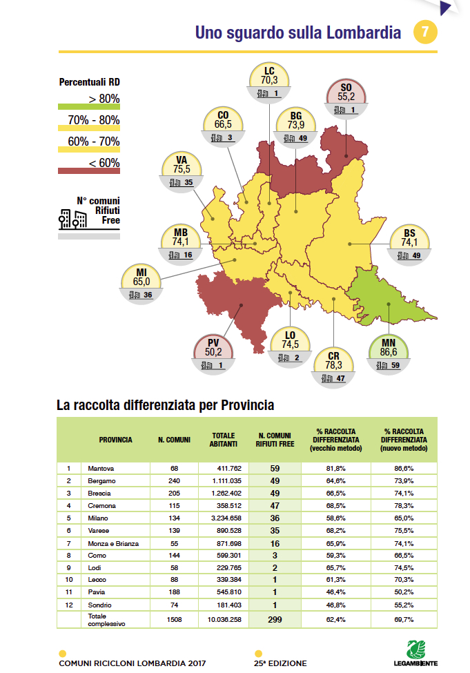 Secondo le stime di Legambiente e il suo tradizionale bilancio dei Comuni Ricicloni, il premio a livello lombardo per la provincia più virtuosa va di diritto a Mantova, seguita da Bergamo e Brescia. Soltanto ottava la provincia di Como (vedi tabella generale regionale accanto).