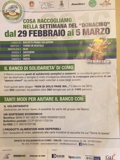 Dal 29 febbraio al 5 marzo ritorna la manifestazione Donacibo, organizzata dal Banco di Solidarietà di Como. In questi sette giorni gli alunni della secondaria Sant’Elia e gli alunni della primaria Don Milani potranno portare ogni giorno a Scuola degli alimenti differenti, contribuendo alla grande colletta di generi alimentari attivata su tutto il territorio provinciale.