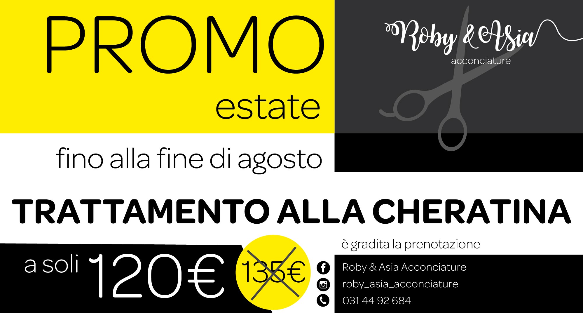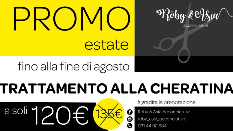 Arriva l’estate ed ecco la spumeggiante promozione che il salone di acconciature Roby&Asia, di Villa Guardia, in piazza Italia, ha deciso di offrire a tutti i propri amici e clienti. Fino alle fine di agosto prenotate il vostro trattamento alla cheratina e avrete la possibilità di beneficiare del prezzo promozionale di 120 euro al posto degli abituali 135 euro. Uno sconto di 15 euro, dunque, per provare un trattamento super!