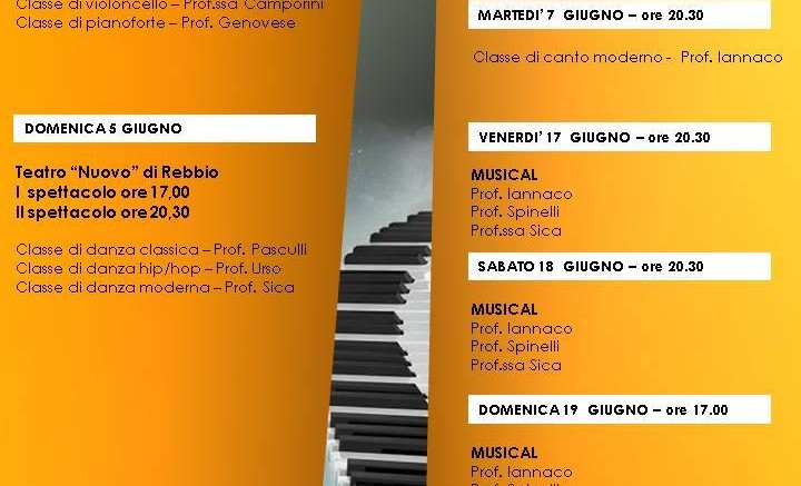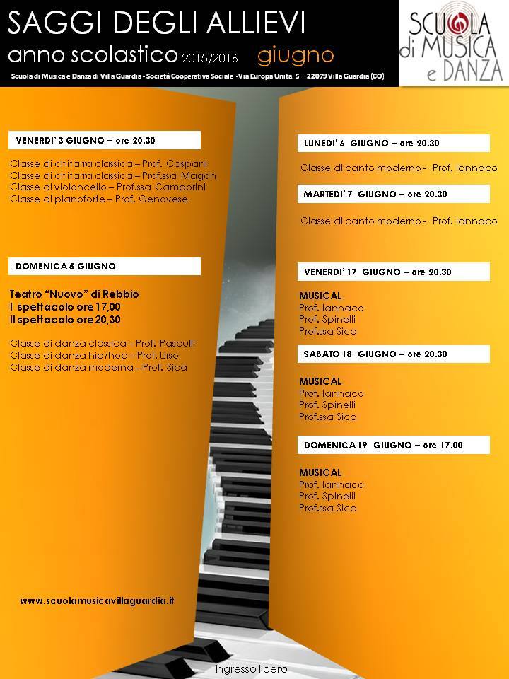 Ultimi giorni di maggio per godersi gli spettacoli di fine anno organizzati dalla Scuola di Musica di Villa Guardia. E già si scaldano i motori per gli spettacoli del mese di giugno. Dal 3 al 19, gli studenti saranno impegnati in saggi, spettacoli, esibizioni, musical e chi più ne ha più ne metta. Una raffica di appuntamenti da non perdere che avrà inizio venerdì 3 giugno con i saggi degli alunni dei corsi di chitarra classica, violoncello e pianoforte. Il rendez vous è fissato all’auditorium di via Europa Unita, alle 20.30.