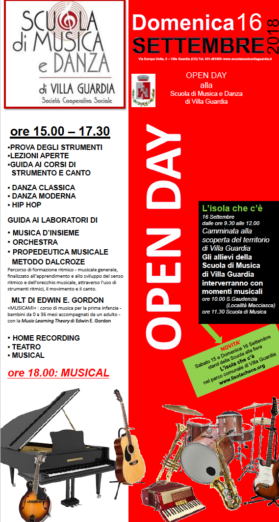 Scuola di Musica Villa Guardia 2018 OPEN DAY Con l’occasione saranno illustrati i corsi di strumento musicale e di canto da parte dei docenti della scuola. Sarà anche possibile assistere a performances degli allievi e si potranno provare gli strumenti musicali. Dalel 15 alle 17.30 sarà tutto un susseguirsi di prove, lezioni aperte, guida ai laboratori, per concludere con un vero e proprio musical, alle ore 18 ad ingresso libero.