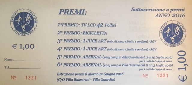 In occasione della Festa dello sport 2016 del Gruppo Sportivo Villa Guardia (10-11-12 giugno) sono disponibili i tagliandi della sottoscrizione a premi.