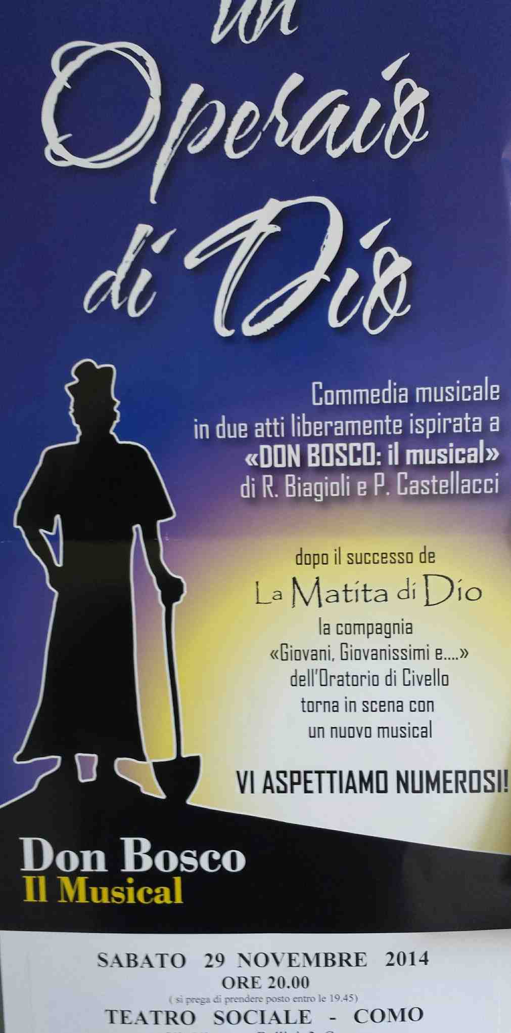 Conto alla rovescia per “il don Bosco dell’Oratorio di Civello al Sociale”! Evento nell’evento, la bravissima compagnia teatrale “Giovani, Giovanissimi e…” domani sera salirà sul prestigioso palcoscenico del Teatro Sociale di Como. Dopo i 400 spettatori fatti registrare dalla compagnia Or.Ma, ecco che anche l’oratorio di Civello si ritaglia la meritatissima serata di gala, presentando al grande pubblico lo spettacolo “Un operaio di Dio”, commedia musicale in due atti liberamente ispirata alla vita di don Giovanni Bosco e al noto musical di R. Biagioli e P. Castellacci. In questi mesi il musical è stato testato e portato in una sorta di tourneè in luoghi decisamente più piccoli e meno suggestivi. Ma per un “prodotto” che davvero ha fatto emozionare quanti lo hanno visto e applaudito, la rappresentazione sul palco del Sociale è davvero un giusto premio alla fatica, alla passione e alla vena artistica dei protagonisti.
