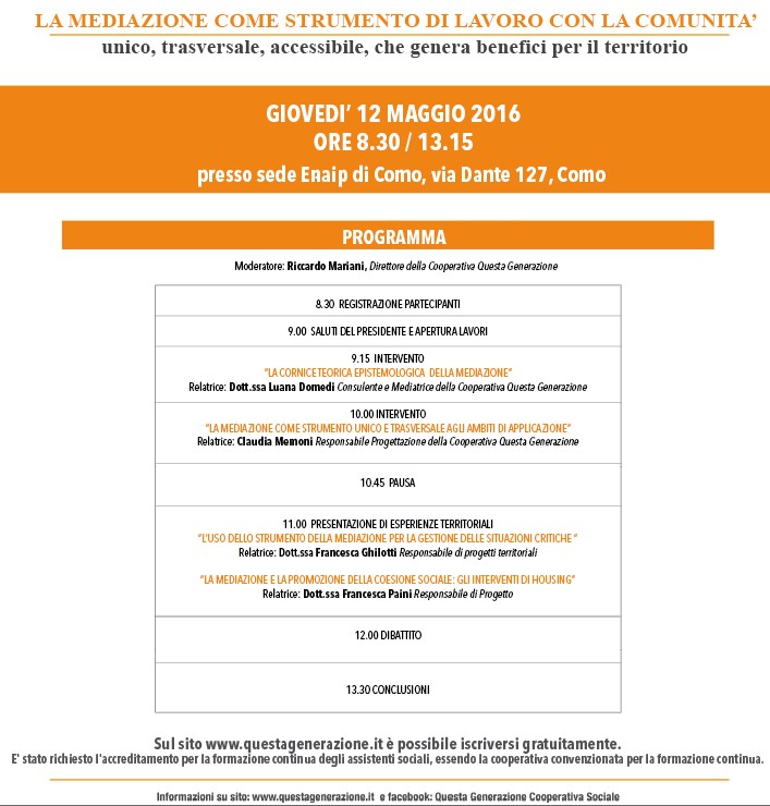 Il convegno “LA MEDIAZIONE COME STRUMENTO DI LAVORO CON LA COMUNITA’ unico, trasversale, accessibile, che genera benefici per il territorio“ si terrà nella mattina di giovedì 12 maggio a partire dalle ore 8,30, presso la sede Enaip di Como, Via Dante 127.