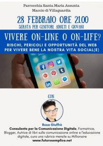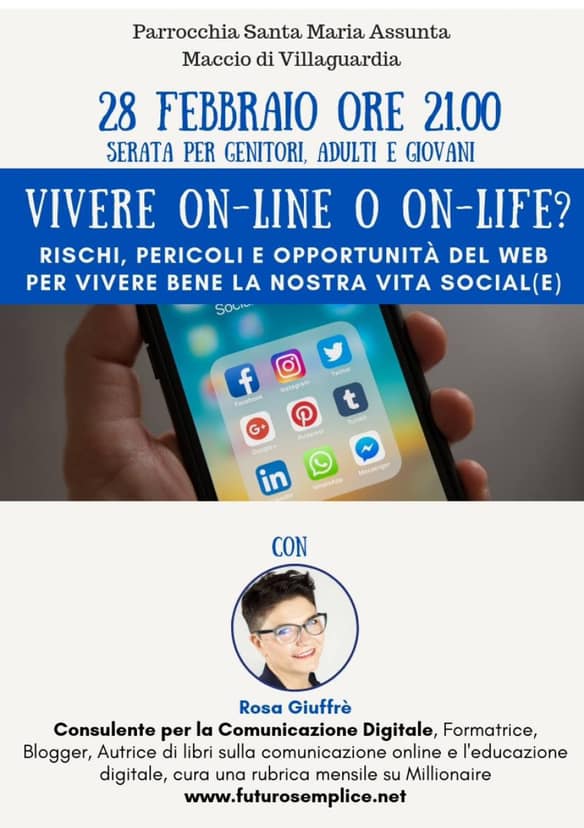 “Vivere on line, rischi pericoli e opportunità del web”. Appuntamento questa sera da non perdere presso le sale dell’Oratorio di Maccio dove Rosa Giuffrè, esperta di comunicazione digitale, blogger di successo e autrice di numerose pubblicazioni, incontrerà genitori e giovani per approfondire le delicate tematiche di una vita sempre più filtrata dagli schermi di pc e, soprattutto, smartphone.